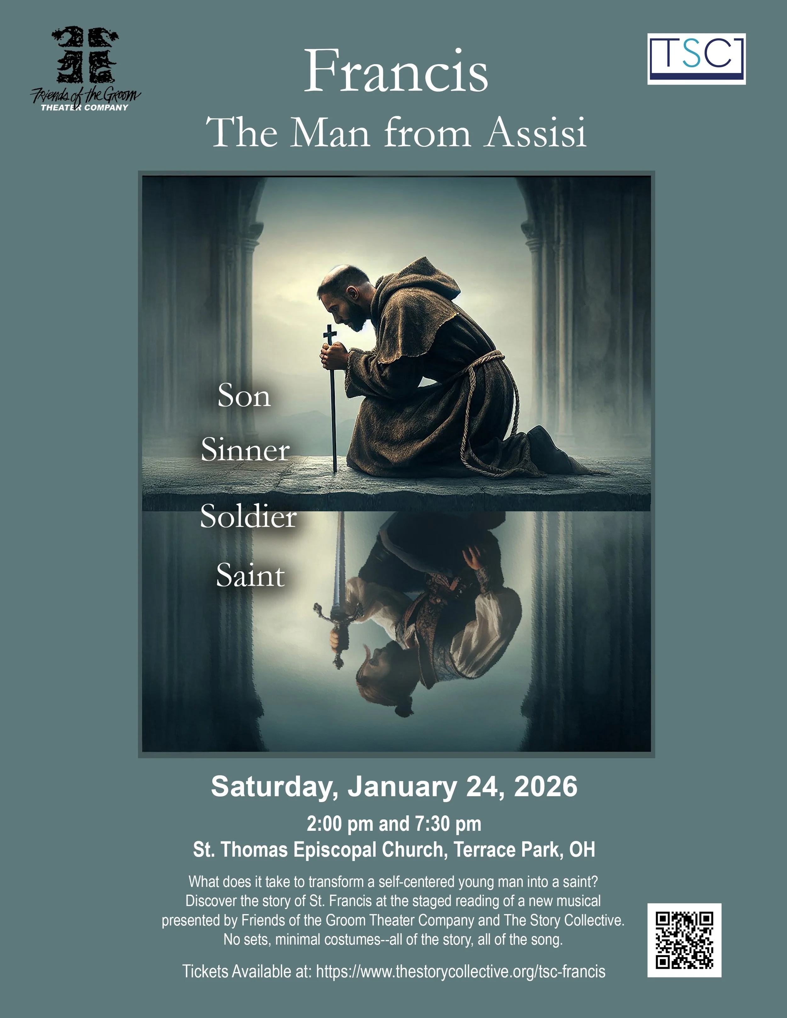 Discover the remarkable story of St. Francis at the staged reading of an original full-length musical, Francis: The Man from Assisi, with performances on Saturday, January 24, 2026 at 2:00 PM and 7:30 PM at St. Thomas Episcopal Church, 100 Miami Avenue, Terrace Park, OH 45174. The project is a collaboration between two professional Cincinnati-based theater organizations: The Friends of the Groom Theater Company and The Story Collective.